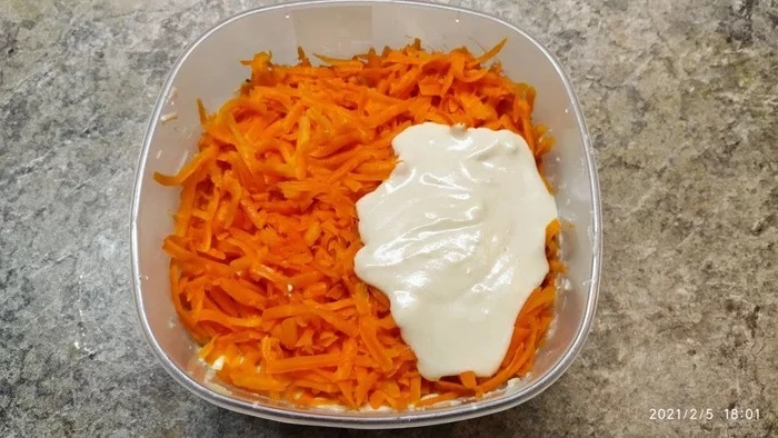 Выкладываем натертую морковь + 3 ложки соуса, размазываем.