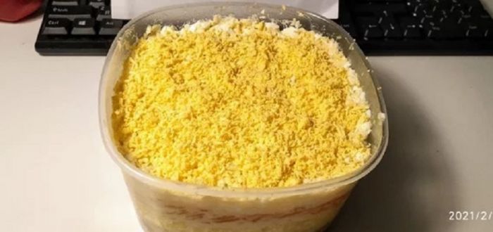 В оставшийся соус добавляем натертый (на мелкой терке) сыр, белок, 2 зубчика чеснока. Тщательно перемешиваем и выкладываем 4 слой, размазываем.С верху натереть желток.
