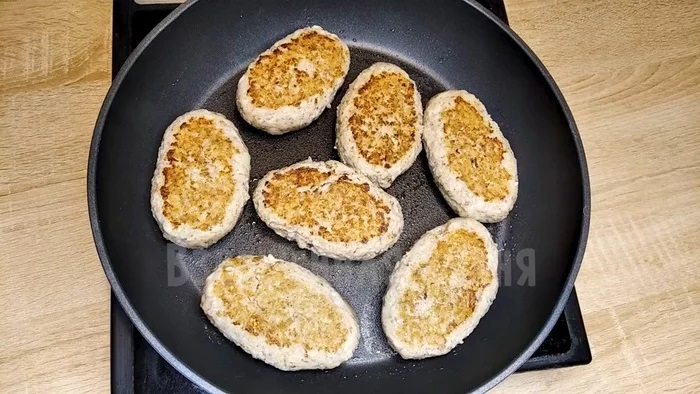 Начинаю формовать котлеты. С помощью весов отмеряю 80г фарша, выбиваю его об ладонь и придаю нужную форму. Сковороду чуть-чуть смазываю маслом и жарю гречаники на небольшом огне. Все котлеты складываю или в кастрюлю, или в вок.