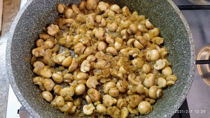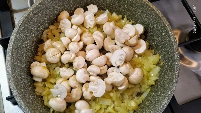 Нарезаем лук, обжариваем на растительном масле до золотистого цвета. Пока обжаривается лук, нарезаем шампиньоны, достаточно крупно (в моем случае резал пополам). Добавляем в сковороду.P.S. Не обращайте внимание, что грибы крупные, они ужарятся.