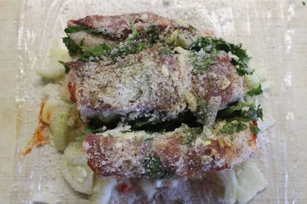 Положить сало на стол разрезами вверх. В каждый разрез положить зелень с солью.