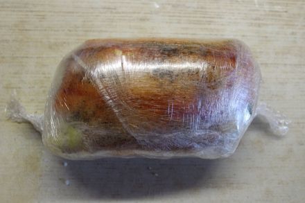 На лук выложить кусок сала и плотно завернуть в пленку.