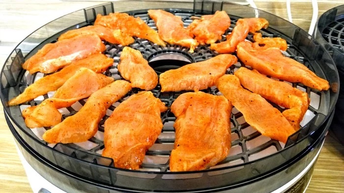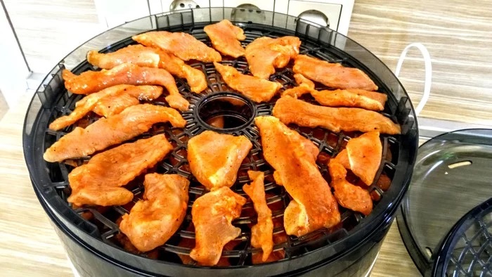 По прошествии 12 часов достаём курицу из холодильника и выкладываем её в сушилку.Выставляем режим 70 градусов на 12 часов.