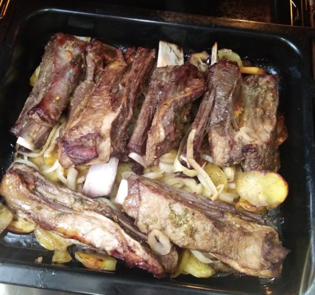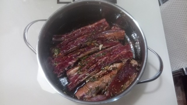 Полученной смесью натираем хорошенько наши ребрышки (говяжьи, ессесно, а не свои), и укладываем в какую-нибудь посудину