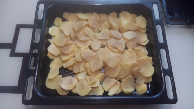 Проголодавшись, вспоминаем о нашей заначке с мясом, идем на кухню, чистим картошку. Кортошку режем-пилим-строгаем, размещаем на противне, солим-перчим на свой вкус