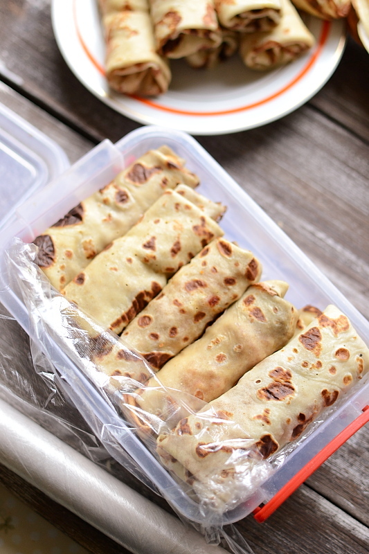 Такие блинчики лучше всего употреблять в горячем виде. Все блинчики мы сразу не съедим, потому часть блинчиков я укладываю в контейнер и отправляю в морозилку