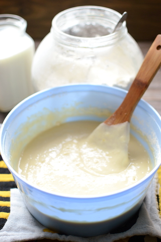 А теперь постепенно подливаю молоко и размешиваю его в тесте. Не перестарайтесь, с очень жидким тестом сложно работать, пусть лучше молоко останется.Но, вы, наверное, всё лучше меня знаете, кого я учу!