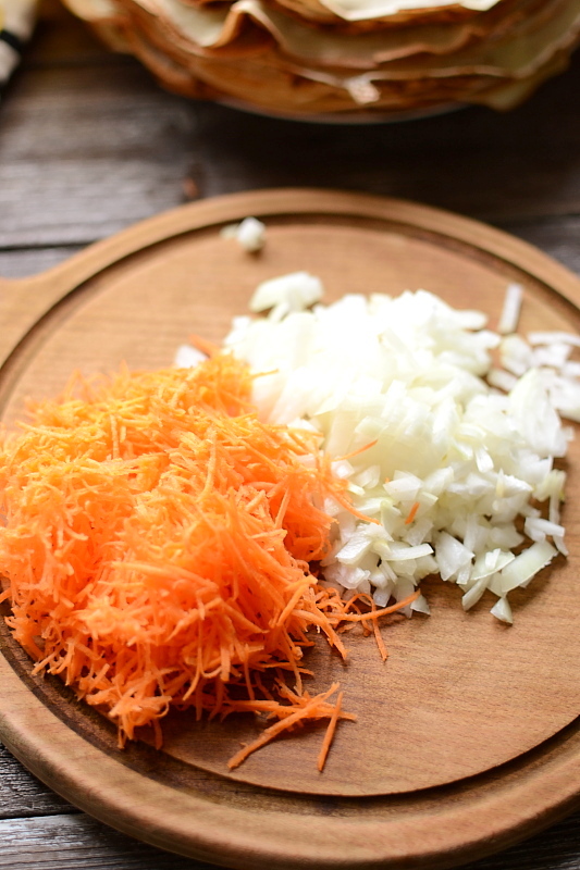 Луковицу мелко нарезаю. Морковку тру на некрупной тёрке, но и не слишком мельчу