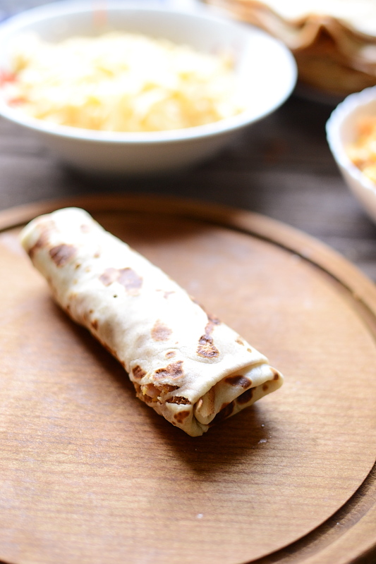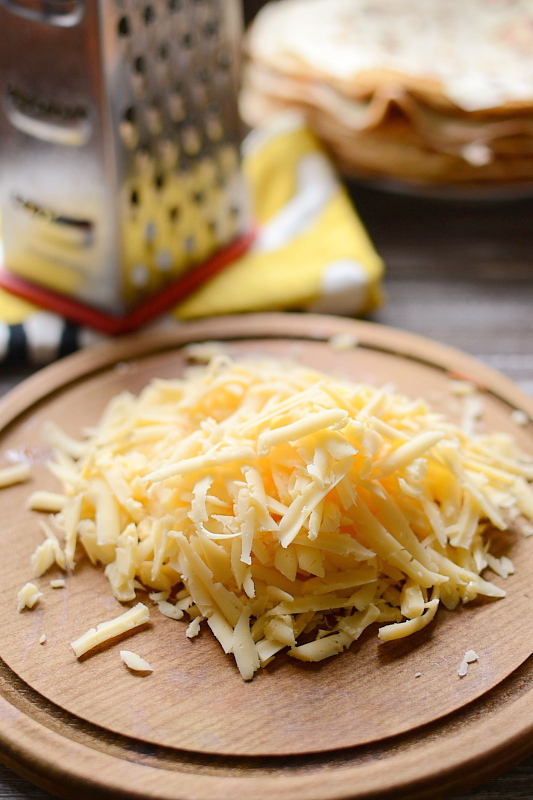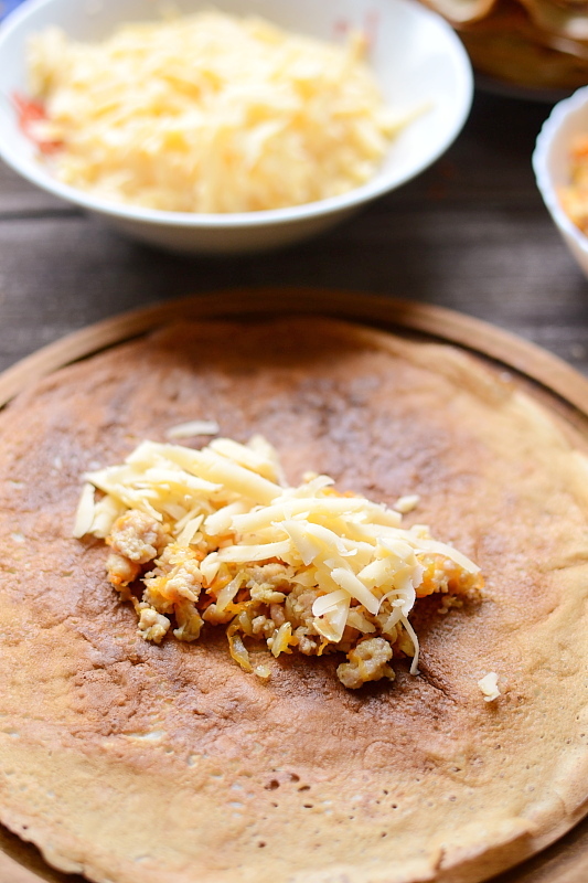 Собираю блинчики: на блин выкладываю немного начинки и посыпаю сыром