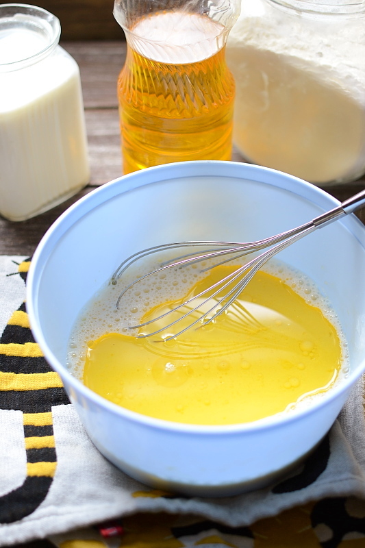 Добавляю муки столько, сколько потребуется, чтобы получить тесто консистенции сметаны. Так вы избежите появления нежелательных комочков в тесте.Я когда готовила специально замеряла, сколько ж я муки впихну. И, представляете, забыла. Готовила-то я в свой выходной, а сейчас взялась описать процесс и сама с себя фигею: здрасте, приехали, не помню. Ну, может, пару стаканов. Короче, добиваемся от теста консистенции сметаны, да