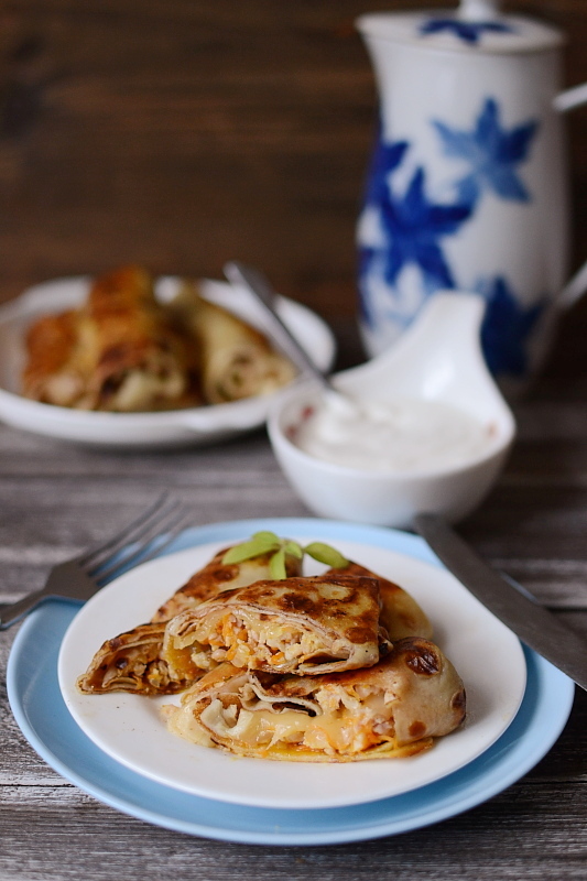 Вы можете взять за основу любые блины, которые любите и умеете печь, тут главное начинка. Я готовлю для блинчиков тонкие блины без каких либо дырочек, ажуров, отверстий и тэдэ тэпэ. Ничего не имею против дырчатых блинов, пока дело не касается начинки. И если мясная, рыбная начинка ни куда не денется, то сочные фруктовые обязательно постараются просочиться во все щелочки и дырочки.Бесит!