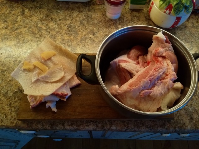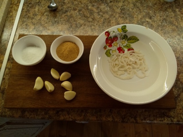 подготовил ингредиенты - соль, смесь перца, муската и тмина, чеснокну и свиные кишки под замочил для гуттаперчевости