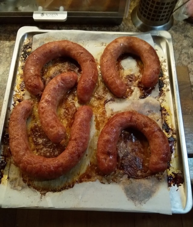 колбаски на бумагу для выпечки и в духовку, градусов под 160-180 на час-полтора