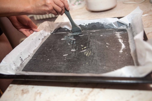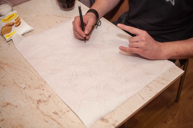 Пока я тут занималась тестом, мой любимый муж решил мне помочь. Взял пергаментную бумагу , карандаш и устроил кружок рисования. (Наносил эскиз жирафих пятен )