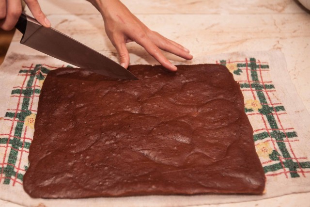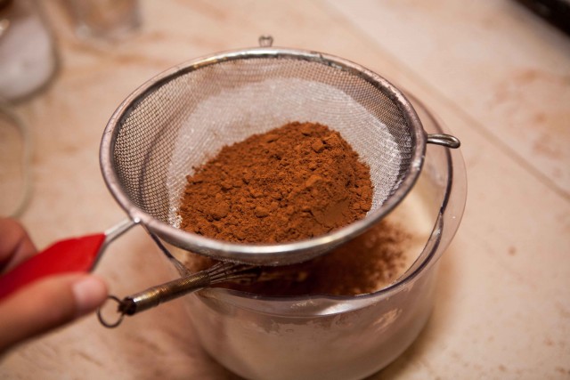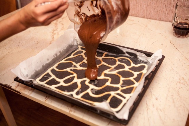 В оставшееся тесто просеиваем какао и аккуратненько перемешиваем до однородного, шоколадного цвета.