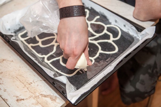 Так как кондитерский шприц сгрыз кот...цинично и надменно...проказник ушастый))), воспользуемся пакетиком. Поместим немного теста в него и в уголочке сделаем маленькое отверстие, для выдавливания теста.