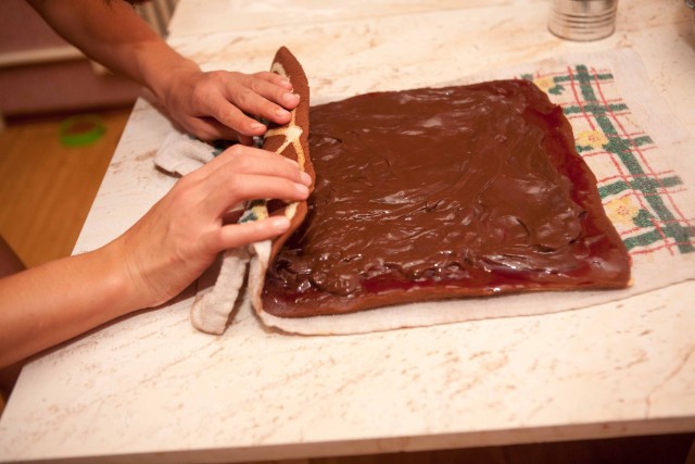 Рисунок на половину печеный, заливаем шоколадной массой и опять в духовку при этой же температуре на 15-20 мин.