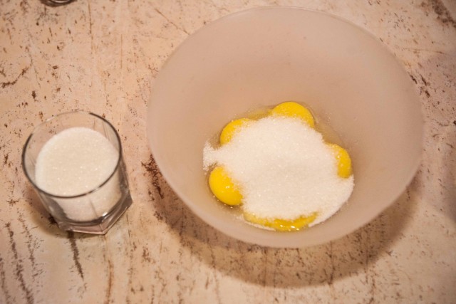 Ну, что? Приступим:Желтки отделяем от белков и добавляем пол стакана сахара.