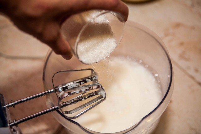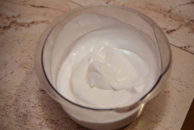 Белки взбиваем с солью и аккуратно добавляем сахар, чтобы не распалась пена.