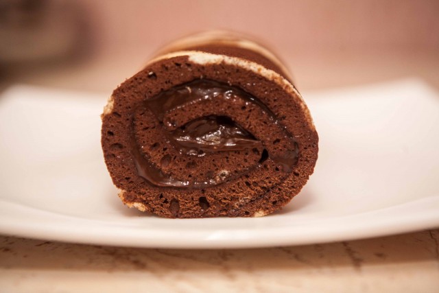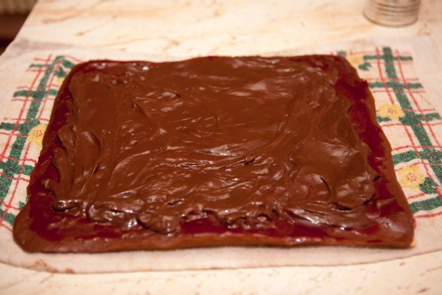 Всё как можно быстренько делаем, не даем остыть ему. Скручиваем в рулет. Я воспользовалась пищевой плёнкой, обернула его потуже и отправила на пол часа в холодильник.