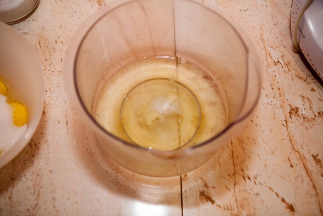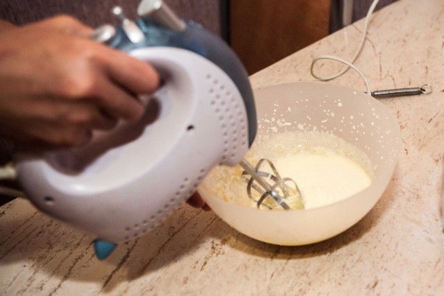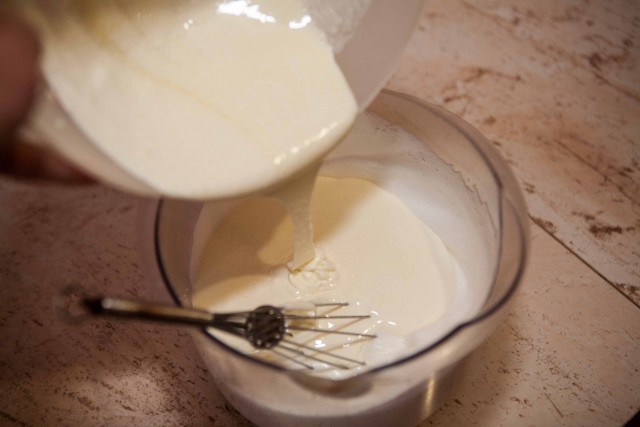 Аккуратненько соединяем желтковую и белковую массы, перемешивая венчиком сверху вниз.