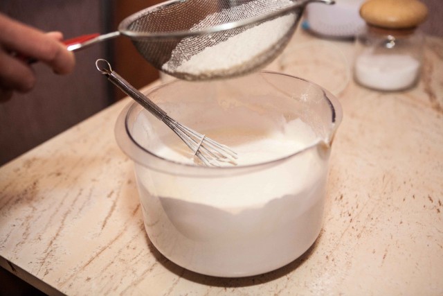 Через сито постепенно добавляем муку, и осторожненько перемешиваем тесто так же сверху вниз.