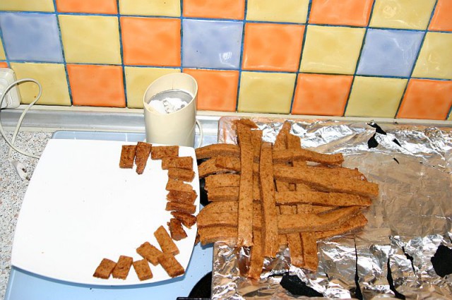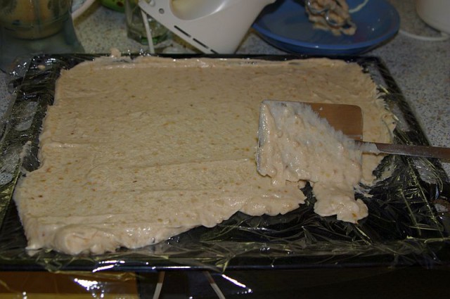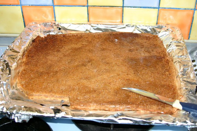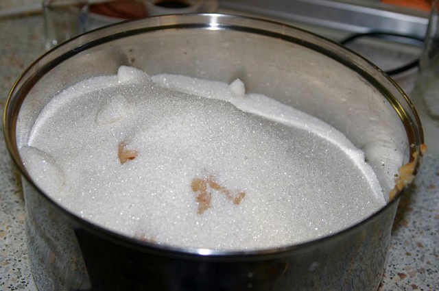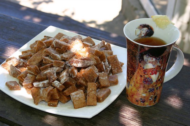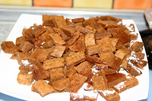 Когда станет наподобие жвачки по вязкости снимаем, нарезаем и послойно просыпаем сахарной пудрой.