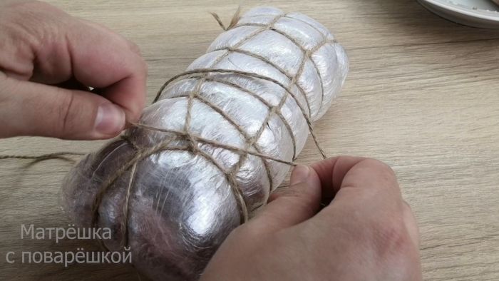 Шпагатом обматываю рулет, как батон колбасы. Со вторым рулетом все также - заворачиваю в пакет для запекания, потом пищевую пленку и обматываю шпагатом.