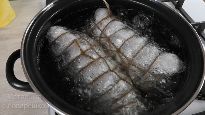 Перекладываю рулеты в кастрюлю и заливаю холодной водой так, чтобы она полностью их покрывала. Ставлю кастрюлю на огонь, довожу до кипения, затем огонь делаю чуть меньше среднего и варю 3 часа.