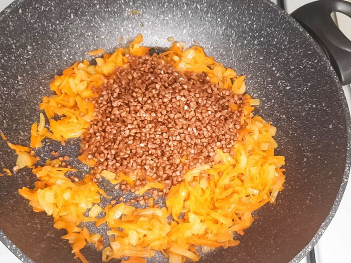 Готовить мою курочку с гречкой я начну с начинки. Лук мелко режу и обжариваю до прозрачности на рафинированном масле без запаха. Морковку тру на тёрке, добавляю к луку. Готовлю зажарку, как для супа.Гречку промываю и добавляю к зажарке, перемешиваю. Вливаю 100 мл воды, солю и варю 10-12 минут до полуготовности, она дойдёт уже потом внутри курицы.