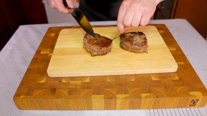 Когда температура внутри стейков достигнет желаемых 57 градусов, вынимаем их из духовки и даём отдохнуть в течении 5 минут. На этом этапе необходимо удалить джутовый шпагат.