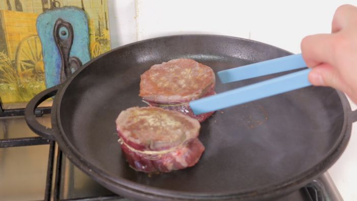Ставим сковороду на максимальный огонь и даём ей хорошо разогреться. В это же время включаем духовку на 200 градусов, чтобы она тоже разогревалась. Отправляем стейки на раскаленную сковороду. Обжариваем их 1.5 - 2 минуты. Затем переворачиваем их и обжариваем со второй стороны столько же времени