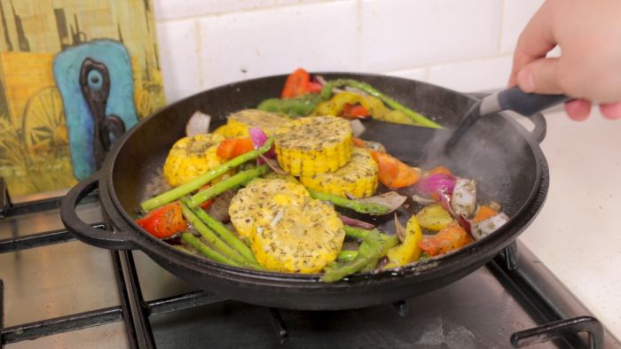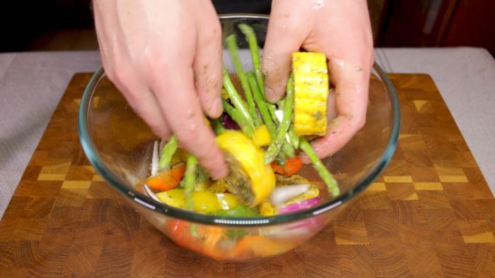 В глубокую миску помещаем произвольно нарезанные болгарские перцы, половинку головки лука, нарезанную дольками, кукурузу, порезанную кружками толщиной 1.5 - 2 см. Туда же отправляем спаржу. Добавляем к овощам прованские травы, соль и немного растительного масла. Перемешиваем содержимое миски.