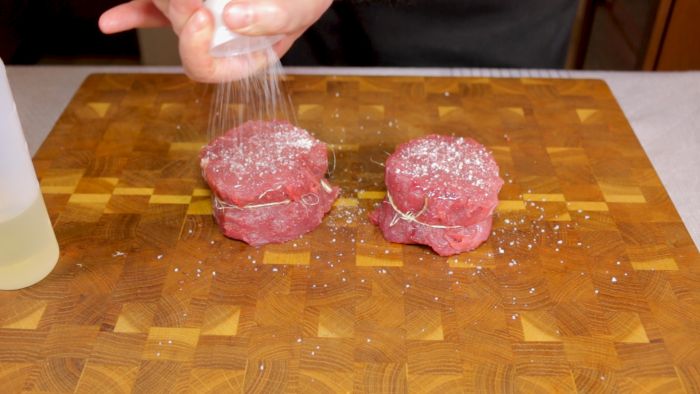 Первым делом необходимо удалить с поверхности вырезки жесткие плёнки. Нарезаем мясо на стейки толщиной примерно 4-5 см. Для того, чтобы при обжарке стейки сохранили правильную форму, я обвязываю каждый из них джутовым шпагатом. Присаливаем каждый стейк морской солью, крупного помола. Добавляем немного растительного масла и распределяем его по всей поверхности мяса.