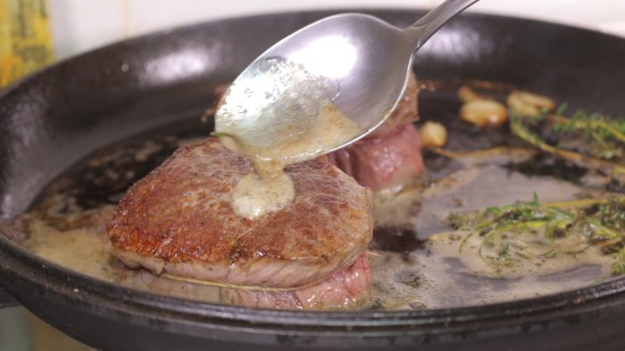 Одновременно с этим помещаем в сковороду сливочное масло сразу же к нему добавляем растительное, чтобы сливочное на начало гореть. А также чеснок. Тимьян. И розмарин. Ещё 2 раза переворачиваем стейки, на этот раз обжариваем их по пол минуте с каждой стороны обильно поливая ароматным маслом.