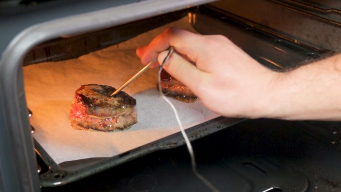 Перекладываем стейки в разогретую духовку. Вставляем в середину одного из них щуп кулинарного термометра. На самом же термометре выставляем желаемую температуру. В моём случае, это 57 градусов. Закрываем духовку и ожидаем пока температура внутри стейков не достигнет желаемой.