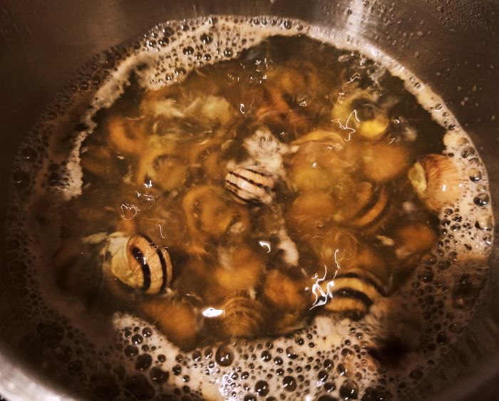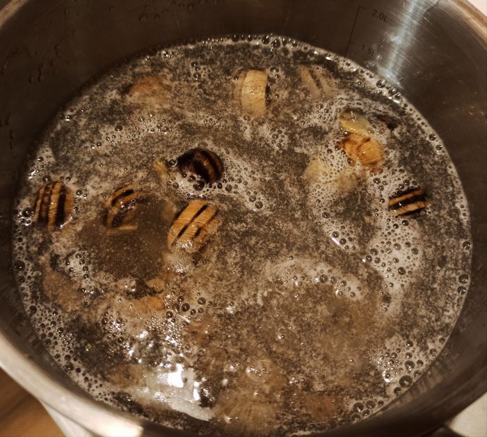 Слив вторую порцию слизи можно приступать к варке. Заполняем другую кастрюлю аналогичным объемом воды, добавляем туда 2 столовых ложки соли, затем в кипящую воду кидаем улиток и варим 15-20 минут. Важно не переварить моллюсков, иначе мясо будет чрезвычайно жёстким. Также не забывайте следить за огнем, вода будет достаточно пенной из-за остатков слизи и может запросто «убежать»