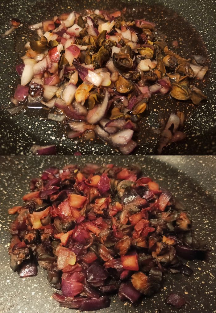 Пока улиточное мясо отмачивается, нужно сделать к нему дополнение. Пусть кусочки выглядят не очень большими, но на деле являются довольно сытными, так что лучше всего их есть с обжаренным фиолетовым луком (порезать в объеме визуально соответствующему кучке мяса 1:1) или отварным рисом. Решено было следовать первому варианту, однако лук нужно обжаривать чуть дольше, чем улиток, так что кладём его на сковородку первым. Минут через 5 можно добавить улиток и тушить это всё ок 10-15 минут на медленном огне.