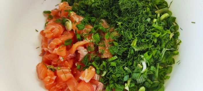 Нарвал в огороде укропа и зелёного лука, нарубить помельче. Добавил соль и перец.