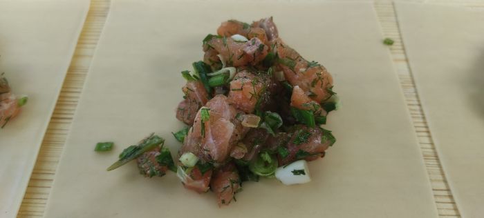 Тесто раскатал толщиной 1мм, порезал на квадратики 150ммХ150мм. Рыбный фарш дожил примерно по 80грамм, завернул в форму мантов и отправил в мантоварку на 20минут. Манты укладываю на пекарскую бумагу, так они не прилипают и достаются без повреждений.
