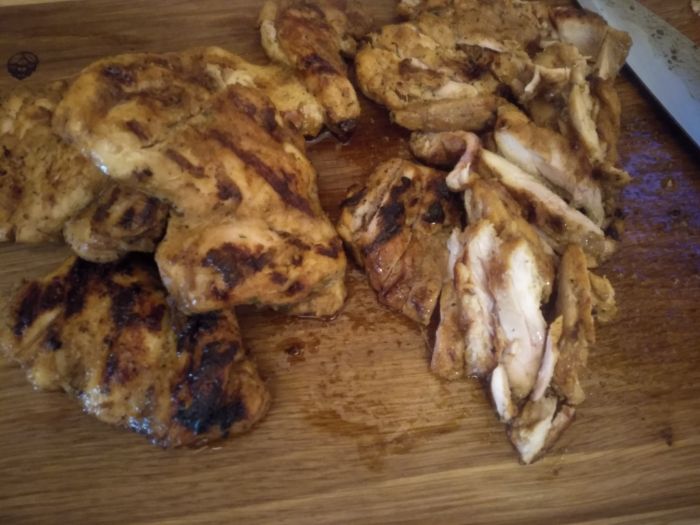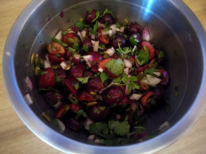 Курица на гриле, сальса из черешни с тыквенными семечками и фета.