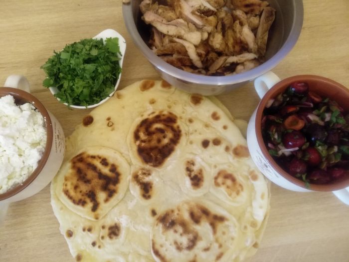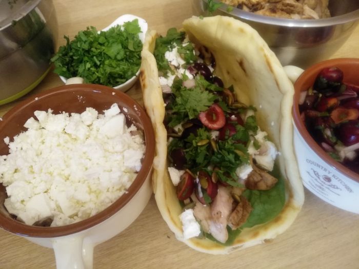 На лепешку выкладываем шпинат, нарезанную курицу, раскрошенную фету и черешневую сальсу. Посыпаем нарезанной кинзой.