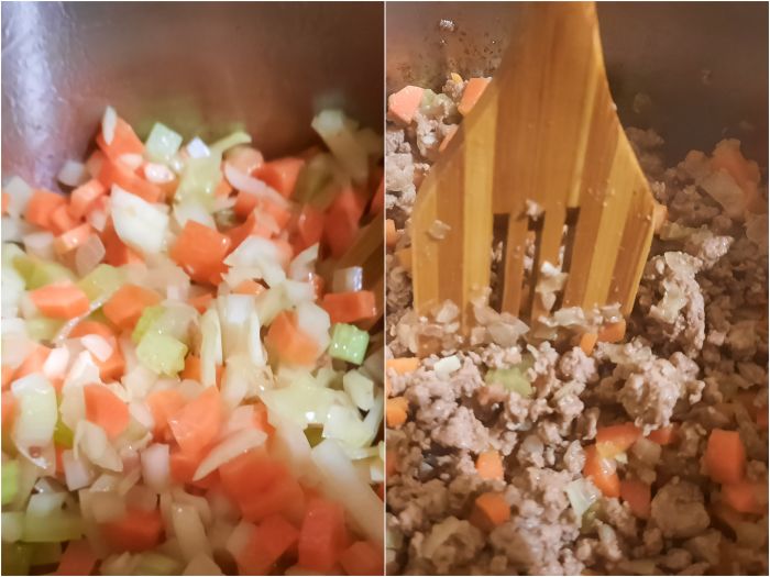 Вот такое длинное вышло вступление, перехожу собственно к рецепту. Для начала нужно мелко нарезать лук, чеснок, морковку, сельдерей и бекон. Аутентичней, конечно, использовать панчетту, но это штука дорогая, а теперь её ещё и хрен достанешь, так что бекон тоже подходит. Фарш для болоньезе я готовлю из говядины, свинину не добавляю.