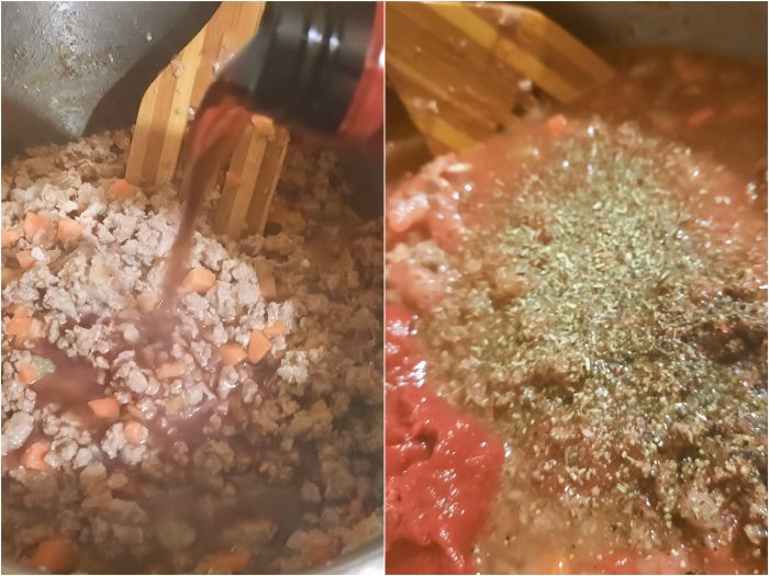 На этом же этапе вливаем воду, солим, перчим, добавляем томатную пасту и итальянские травки. Я обычно использую базилик, розмарин и орегано.
