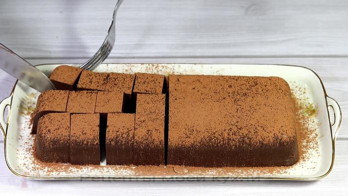 Готовый десерт извлечь из формы, присыпать какао порошком, нарезать порционно и подать к чаю.
