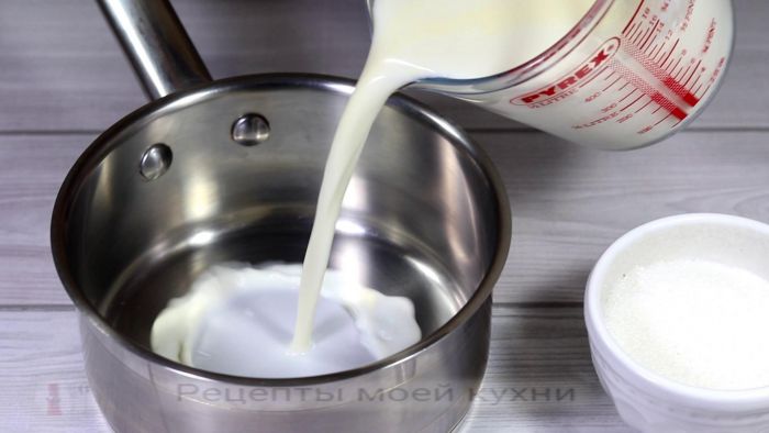 От общего количества влить 400 мл., молока в ковшик, всыпать сахар и соль поставить на слабый огонь для подогрева.