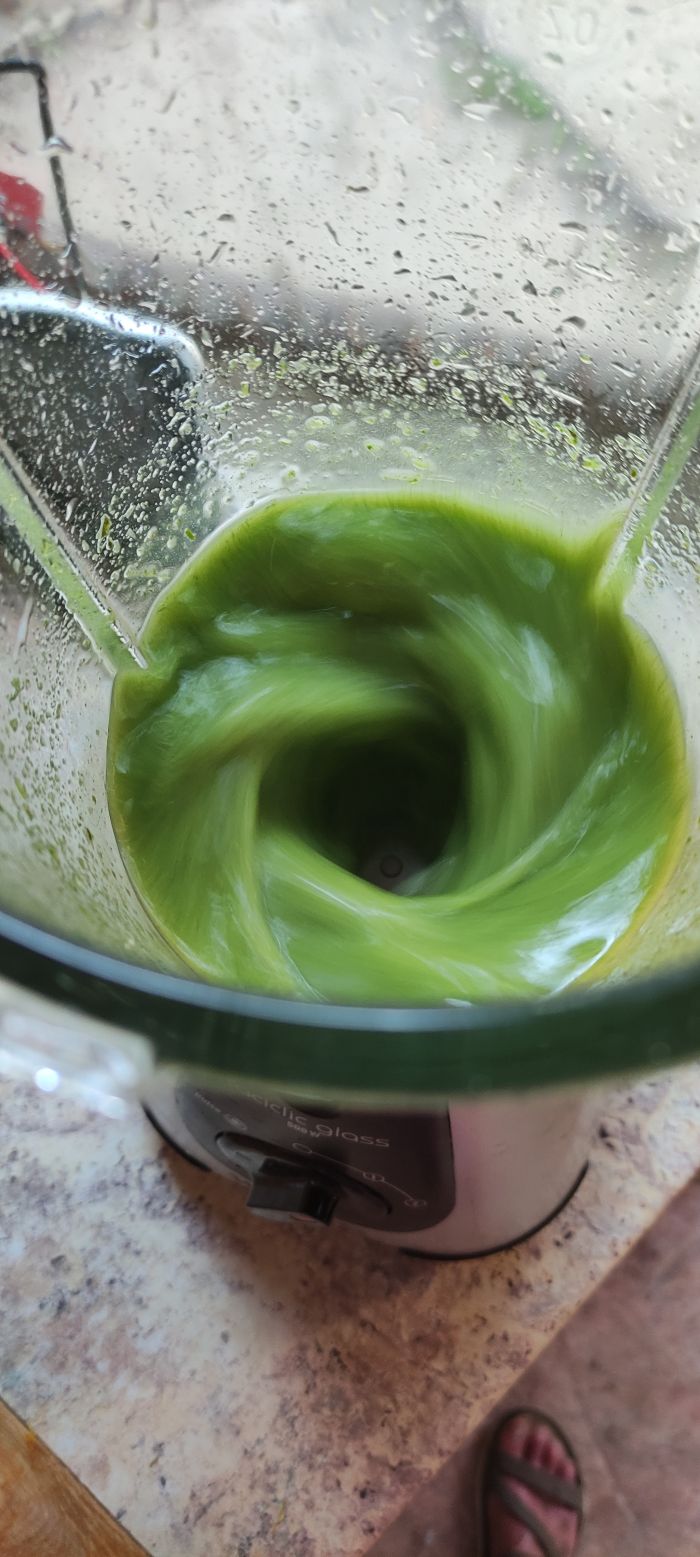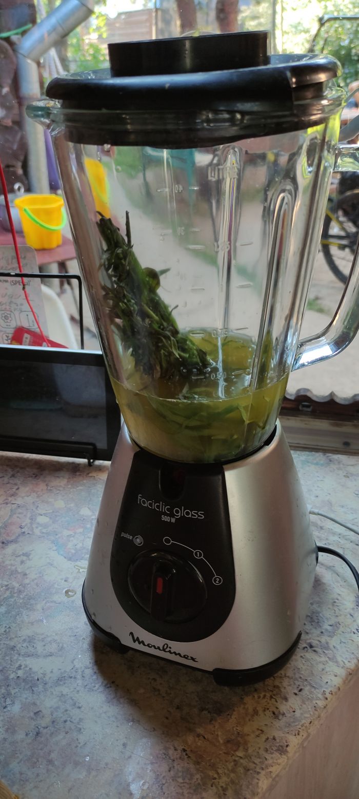 1/3 от всего рыночного пучка (как у меня в ладони) тщательно моем и в блендер. Не советую брать больше этой травы. Я один раз из целого пучка сделала. Язык щипало знатно.