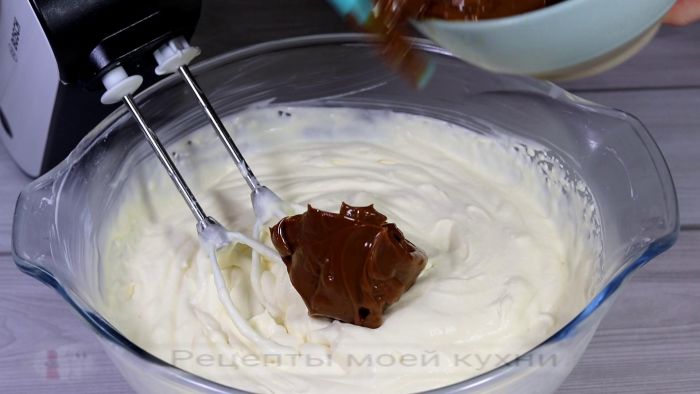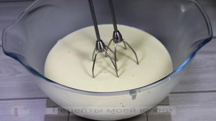 В ёмкости взбить охлаждённые сливки до слабых пиков