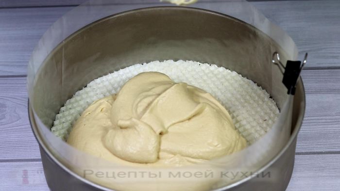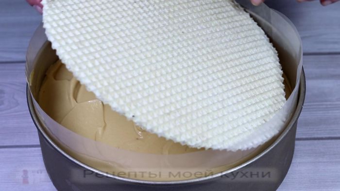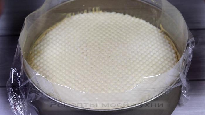 Бортики формы, 23 см., застелить кулинарной плёнкой. На дно формы положить вафельный корж, на него выложить подготовленную смесь, разровнять.
