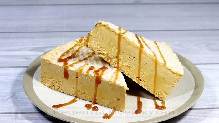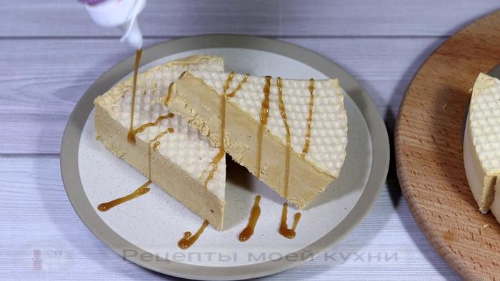 Готовое мороженое вынуть из формы, нарезать на порционные кусочки и можно подавать десерт.
